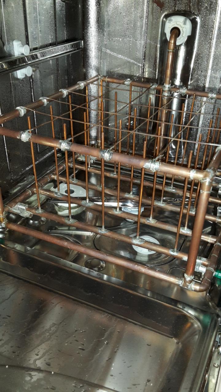Apakšējais propellers griežas kā ir un apskalo pudeles no ārpuses, "grābeklis" uz kura liekas pudeles vienojas pie augšējā plaukta pieslēgvietas un špricē katru pudeli no iekšpuses.