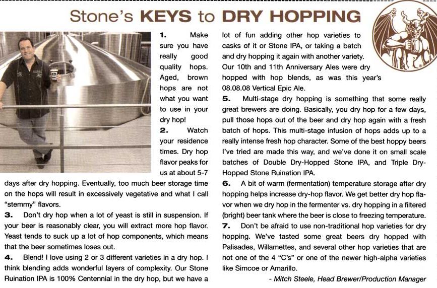 ''I dry hop in the fermenter while the beer is warm, I’ve found that the essential oils are better solubilised this way. I dry hop at the end of fermentation, once the beer is below 1.020 or so, at this point there’s still a moderate convection current occurring from the fermentation that will distribute the hops through the beer but the fermentation is not so vigorous that the delicate aromas are stripped off. I look for a maximum of 3 days with the hops in the beer while it’s warm, then chill the beer for 24-36 hours and transfer off the yeast and spent hops.