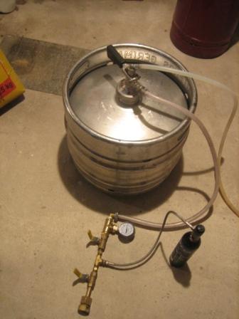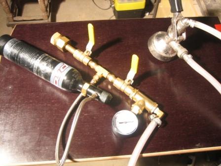 Jā balons ir no peintbola un visa uzparikte ir peintbola balonu pildāmais, kam ieliku troiņiku un manometru. Mazo balonu uzpilda slēdzot pie lielā balona bez reduktora. Lielo balonu griež ar kājām gaisā, lai CO šķidrā veidā pārieu uz mazo balonu. Karstā laikā prasās mazliet iepildīt un izlaist, lai atdziest mazais balons. Pildot mazo balonu liek uz svariem un pilda pēc svara. Par šļauciņu nepateikšu, jo tā uzparikte pirkta jau gatava. Pāris gadus atpakaļ maksāja ap 40Ls. Balons ir 9oz, un tajā ielien ap 300g co2. Ir arī lielāki 16oz, 20oz. Spiedienu kegā regulē ar roku pagriežot krānu. Var ļoti precīzi regulēt. Un ja nu roka notrīc var tak palaist nost.